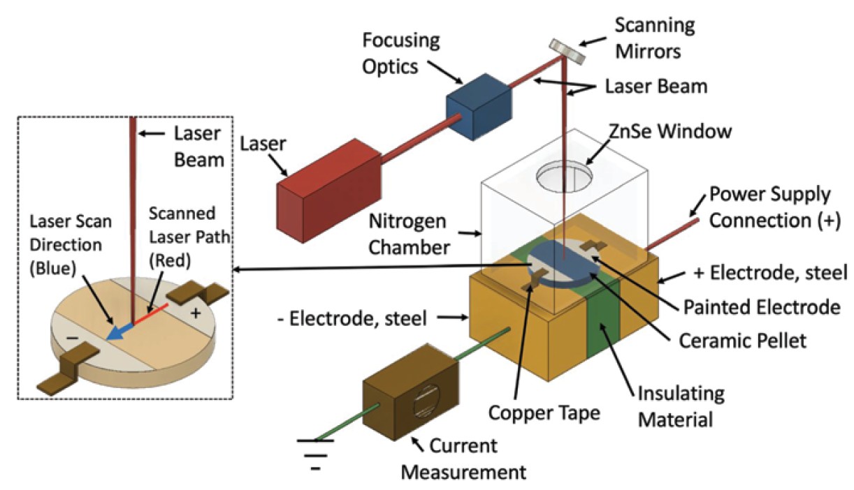 Later, this same research group developed a new laser assisted method in which small regions on the surface of an 8YSZ green pellet were sintered with a laser while an electric field was sustained by electrodes in contact with that surface (Fig. 1).22 This custom-built selective laser flash sintering system reduced the necessary laser power to achieve densification.