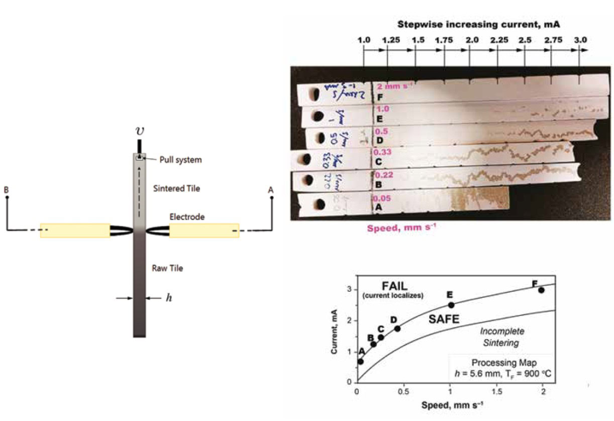 The authors developed processing maps in the parameter space specified by the current density and pulling speed, and they identified three regimes. If the current was too low, then sintering was incomplete; if it was too high, it led to localization of current and poor microstructure. The safe regime lay at intermediate current densities and, rather surprisingly, at high speeds. In hindsight, they learned that uniform current densities through the workpiece could be obtained even when the contact between the electrode and the surface of the ceramic was sporadic, without too much attention being given to obtaining a good contact. Video images of the process gave clear evidence of the formation of a plasma at the interface between ceramic and electrode, which evidently was enabling uniform current flow, acting as a pseudo floating electrode.