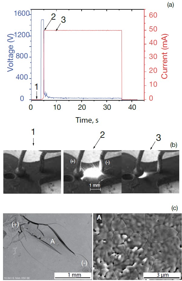 Figure 4. Type II experiments, pair of electrodes in contact with the surface of a 3YSZ specimen containing 3 wt.% silver. (a) Electric parameters. (b) Luminescence changes with time and current. (c) Micrographs of the surface after flash sintering. Credit: Ingraci Neto and Raj