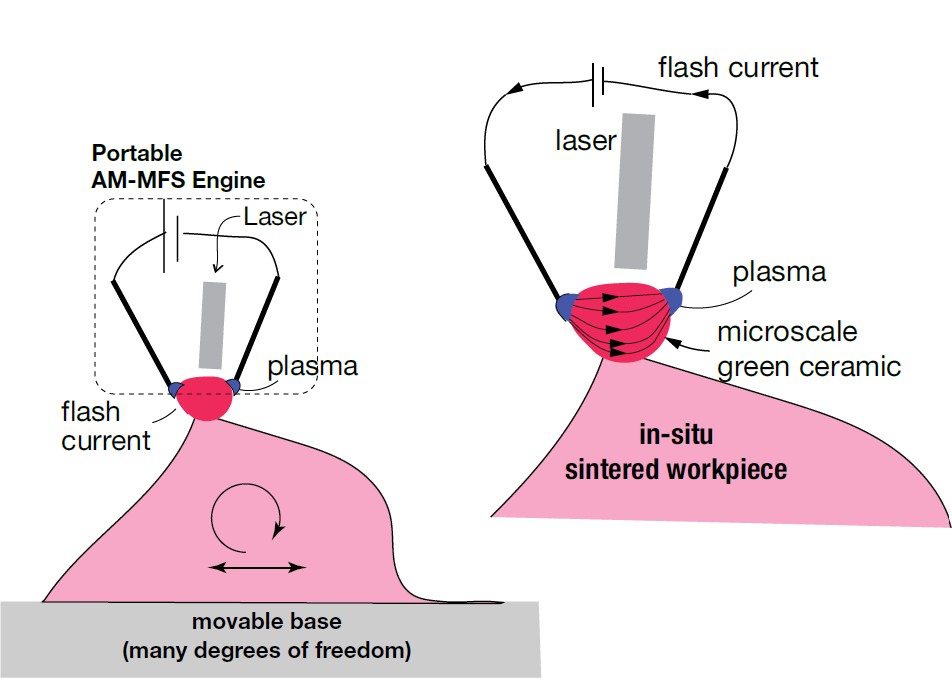 A schematic of an engine for AM-MFS is illustrated in Fig. 5. A plasma jet can be added to promote contactless electrodes. The engine can be designed as a portable stand-alone system that can be incorporated into various additive manufacturing systems. The spot for flash sintering is heated with the laser. (The heating source can also be a spot-heaters powered by infrared lamps; they are commercially available.) The laser and the electrodes are ganged to one another and adjusted together, in tandem, for microsintering on the surface of the workpiece.