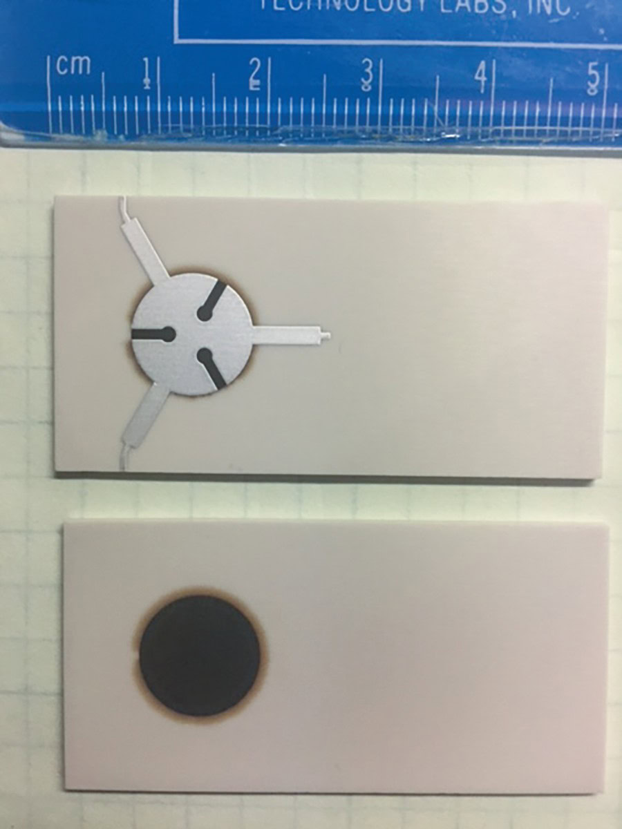 One likely direction for 5G technology is the integration of various functional components into a module. This can be done readily with polymeric platforms or even planar LTCC materials. Our direction is to take the “cofiring” process a step further and integrate multiple components on a ceramic substrate. The core of the device is a microstrip circulator with the ferrite cofired onto a microwave dielectric material. This material can be LTCC based or a tailored material with a higher dielectric constant than most currently available LTCC materials (which rarely have dielectric constants greater than 10). This ceramic substrate may allow for surface mounting of additional devices, including low noise amplifiers and GaN power amplifiers (Figure 5), and may connect with antennas through vias in the ceramic substrate.7