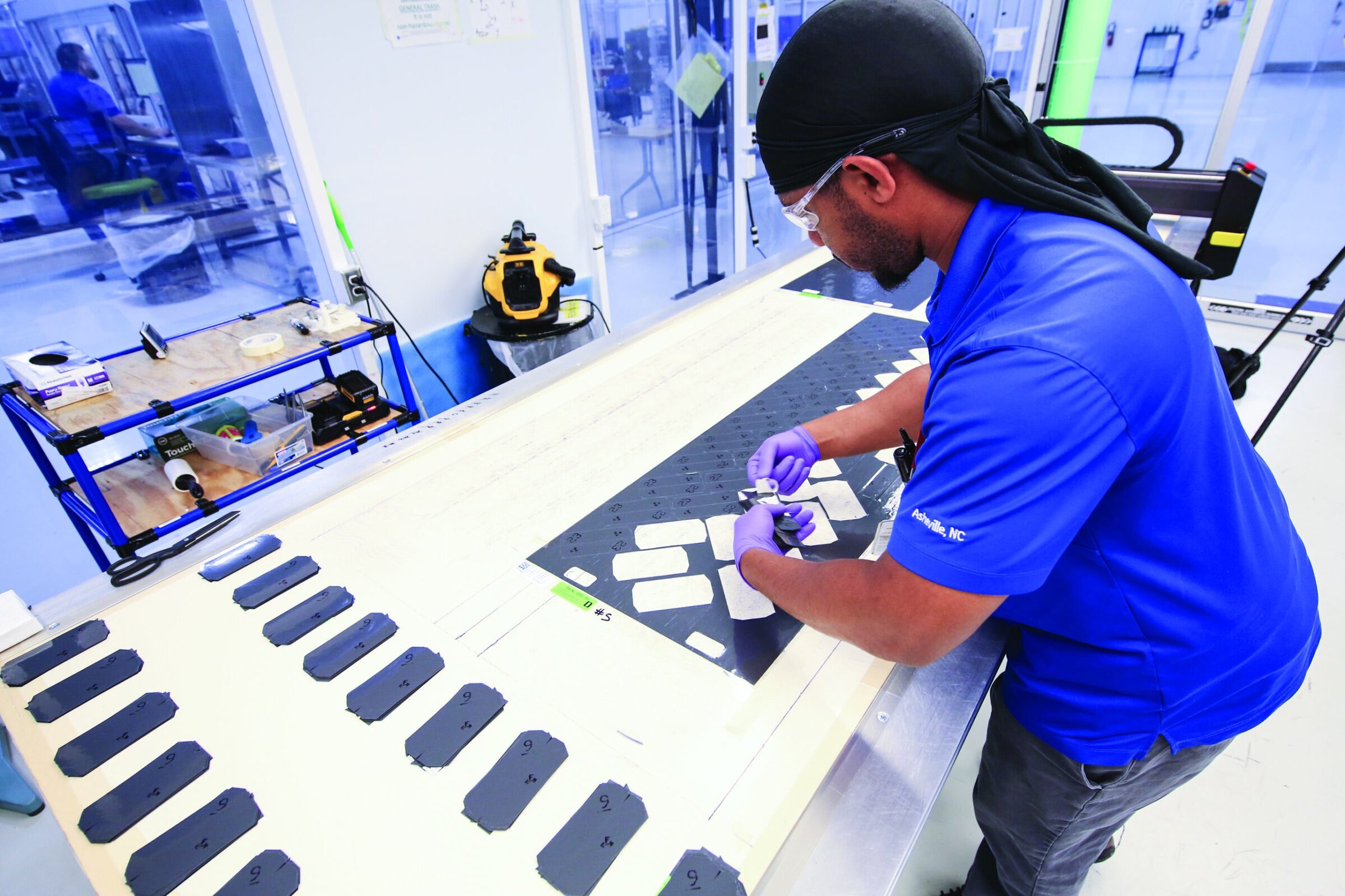 Figure 4. Ply shapes being removed from a tape immediately after ply cutting operation has been completed. Asheville, N.C. Credit: GE Aviation