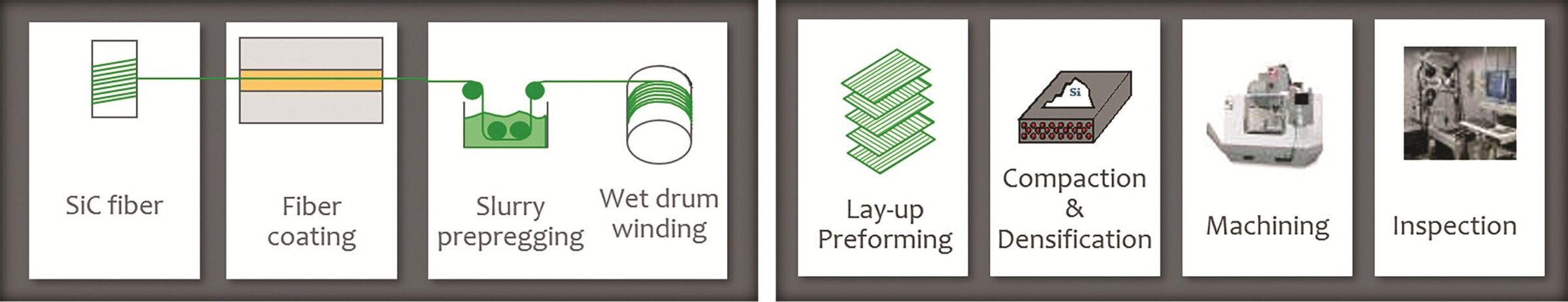 The tape is subsequently cut into shapes and stacked in tooling to create the finished part geometry after consolidation in an autoclave (Figure 4). Two high-temperature furnace operations follow. First is a pyrolysis step to remove any remaining organics, and the second step involves molten silicon infiltration to convert residual carbon to silicon carbide. The densified composite preform is then ready for machining to finalize the geometry, and inspection to ensure conformance of the dimensions and material requirements. X-ray computed tomography (CT), ultrasound (UT) and infrared thermography (IR) are the leading modalities when it comes to SiC-SiC CMC inspection. Application of an environmental barrier coating (EBC) is the final step to protect the CMC material from high-temperature water vapor. The manufacturing process, scaled-up to full production rates at GE Aviation, takes less than 30 days to convert SiC fiber to a finished part of any geometry.