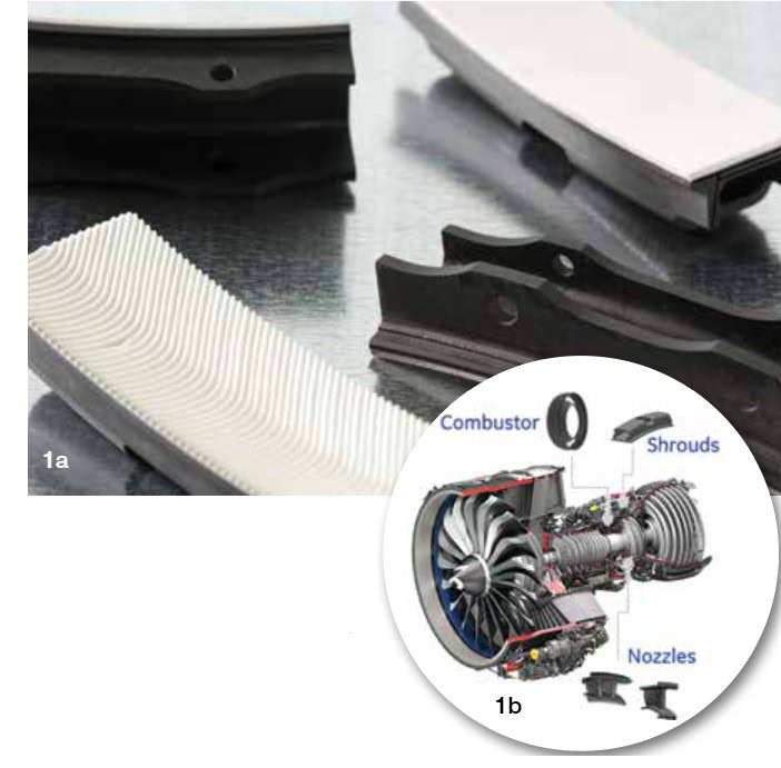Figure 1a. CMC high-pressure turbine shrouds. Figure 1b. Schematic drawing shows use of CMC components in jet engine. Credit: GE Aviation