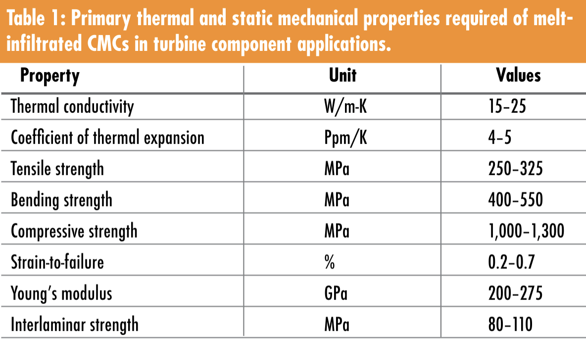Table 1 summarizes the primary thermal and static mechanical properties considered for turbine component applications. The MI SiC/SiC properties represent a range of average values for temperatures between 1,500˚F and 2,400˚F. In general, the mechanical properties are relatively high, with the compressive strength about four times greater than the tensile strength, achieving values that exceed 1,000 MPa. The in-plane mechanical properties have been characterized extensively to understand the cyclic durability as statistically-derived design allowables have been established for over 100 different material curves. Also, the high interlaminar strengths (exceeding 100 MPa) observed in GE’s MI CMC are a key to its use in more complex turbine airfoils.