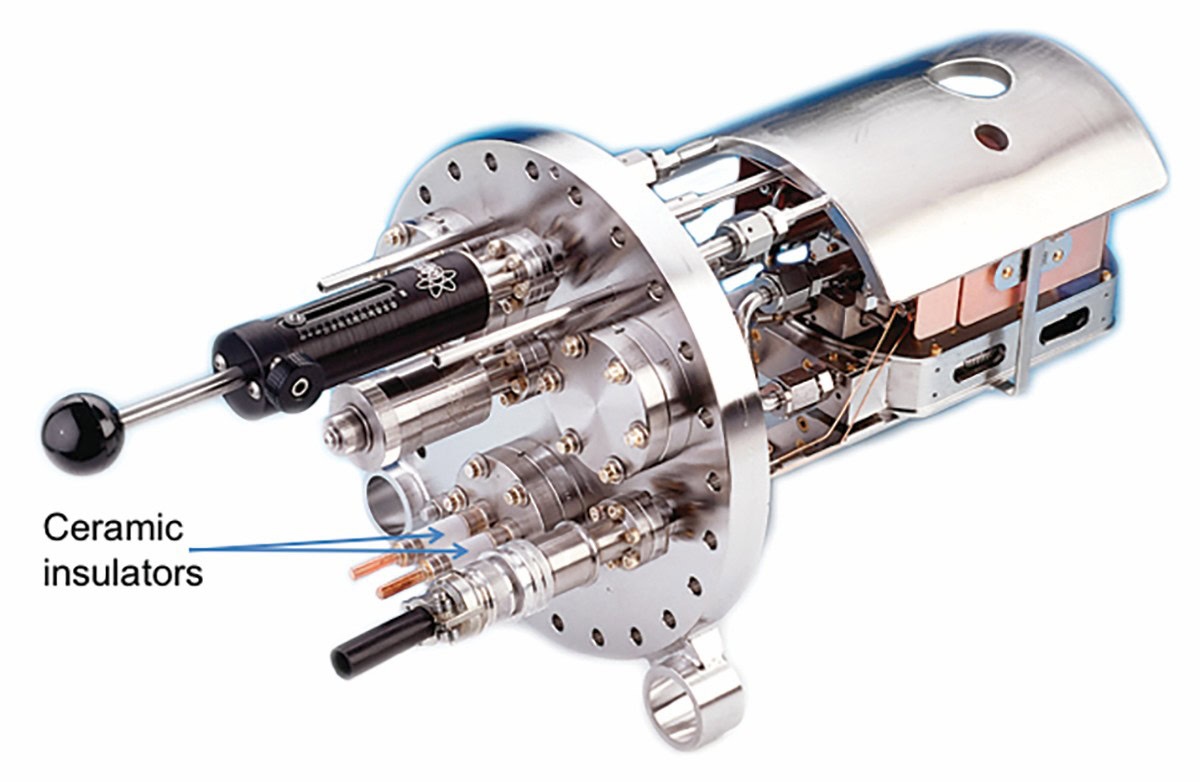 Figure 1. Ceramic–metal (high voltage, high current, and electromagnet sweep) feedthroughs are evident in this image of a vacuum evaporation source, courtesy of MDC Vacuum Products. Credit: MDC Vacuum Products