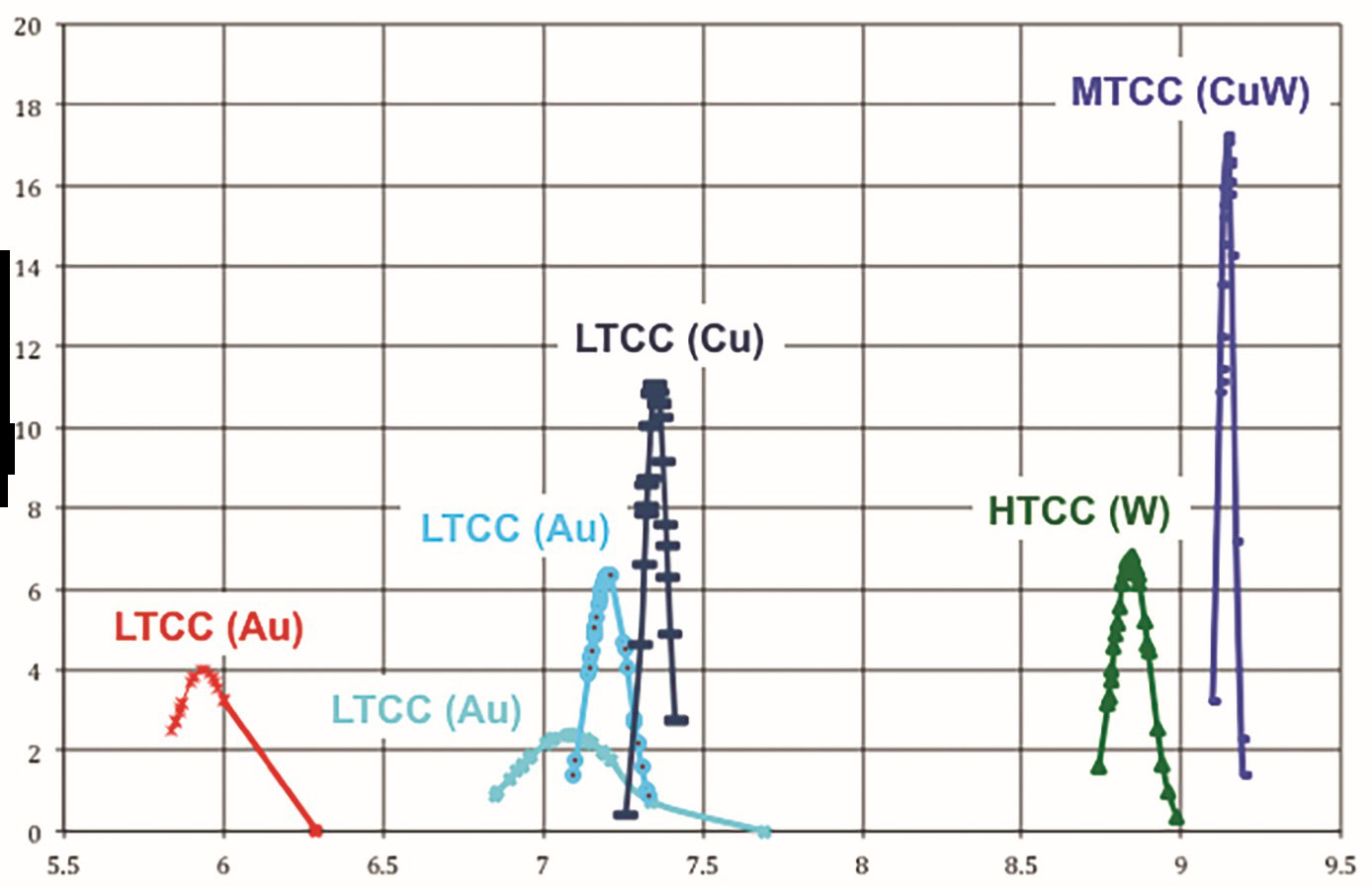 Figure 10. Distribution of dielectric constant at 10 GHz in multilayer ceramic materials: LTCC with copper or gold conductors, HTCC with tungsten conductors, and a medium-temperature cofired ceramic (MTCC) that employs a composite CuW conductor and is fired at ~1,300°C. Credit: Kyocera International Inc.