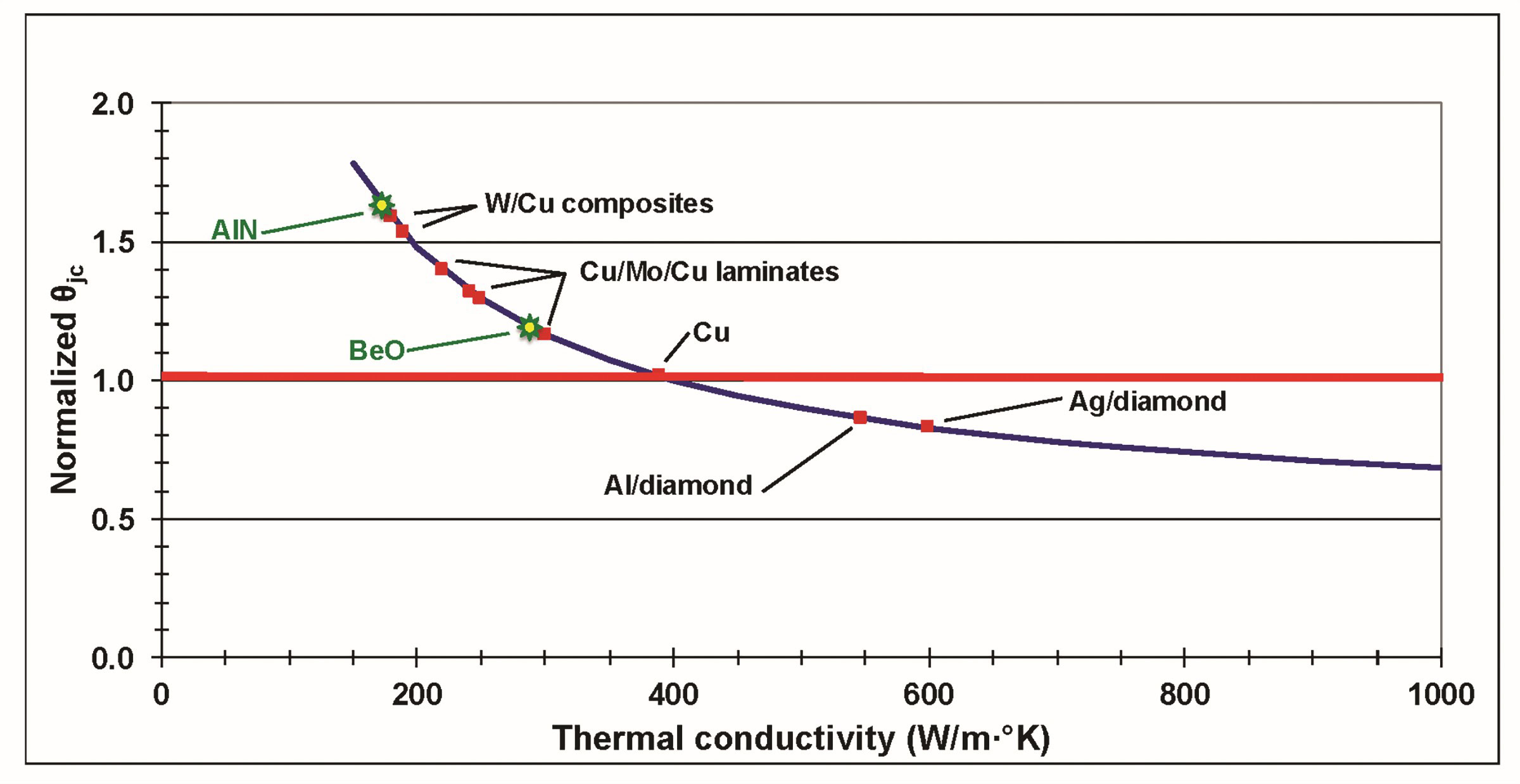 Figure 6. Thermal performance of an LDMOS-style package, as reflected in thermal resistance (θjc) normalized to a copper heat sink (thermal conductivity = 400 W/m∙°K). Note that an Al2O3 heat sink results in a normalized value of 7–12.2 Credit: Kyocera International Inc.
