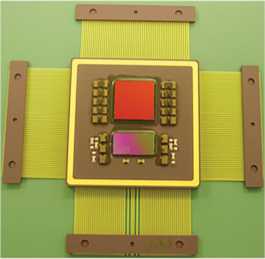 Figure 11. Satellite digital-to-analog converter (DAC). This multichip module includes Si and SiGe chips and decoupling capacitors to enhance signal integrity. The device is shown without its hermetic lid. Credit: Kyocera International Inc.
