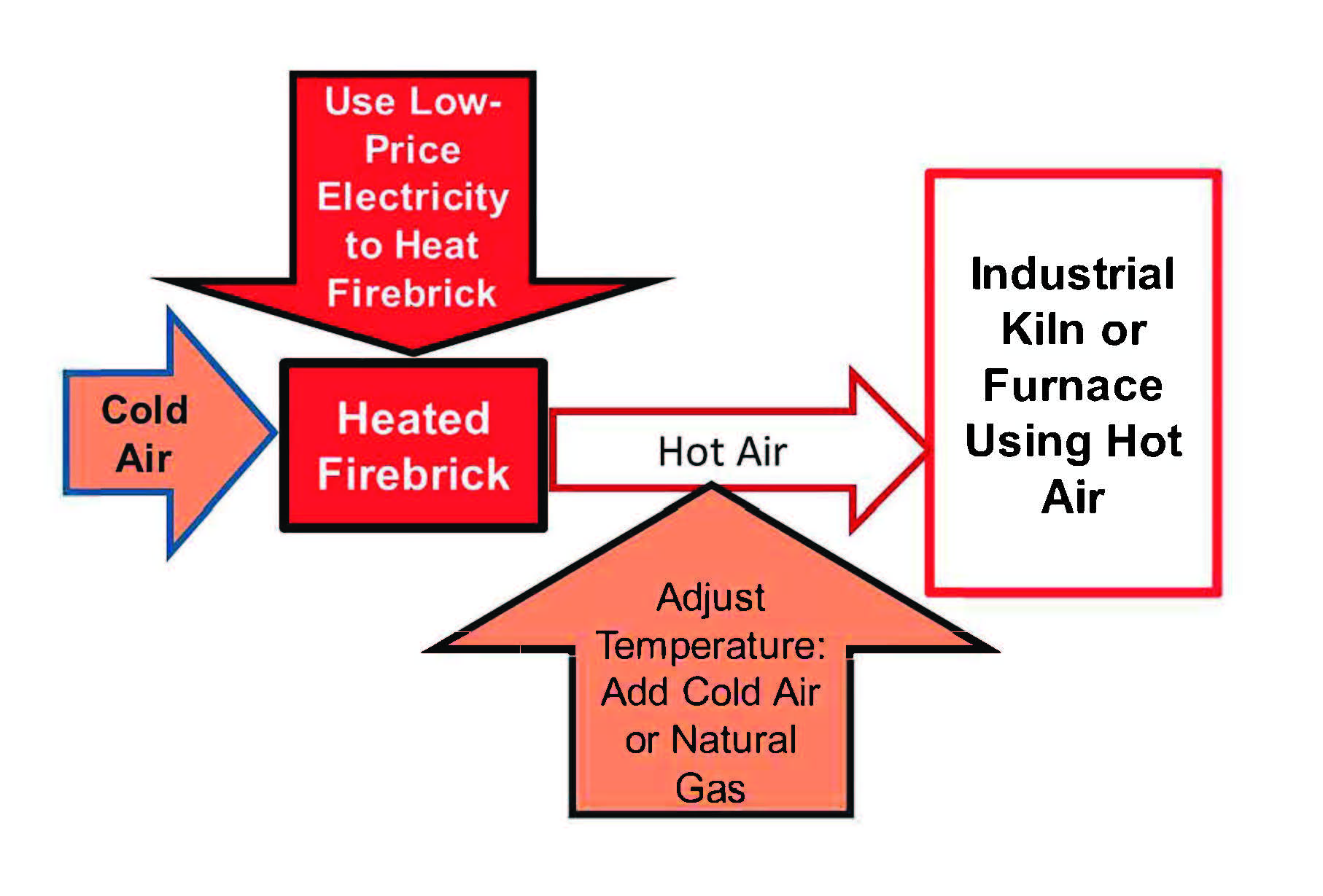 FIRES has two major components: firebrick and electric heaters. The concept of FIRES has a great deal in common with firebrick recuperators used today in industry that were originally developed for open-hearth steel furnaces of the early-20th century. In these large systems, hot air was blown across the surface of molten pig iron (~1,600°C) to convert pig iron into steel by oxidizing the carbon in the pig iron. The hot off-gas from the furnace flowed through one of two firebrick recuperators in which the hot gas flows over cold firebrick, transferring heat to the bricks before exhausting to the stacks. Later, the direction of air flow through the system was reversed, such that cold air enters and flows through the now-hot firebrick, thereby preheating the air. The hot air from the recuperator was further heated with oil before going to the furnace. The air temperatures had to be maintained above 1,600°C to avoid freezing the pig iron and freezing the liquid metal surfaces. Firebrick recuperators are used today in the steel, glass, and other high temperature industries to recover heat to lower energy costs. There is a century of experience in operating industrial recuperators up to about 1,800°C.