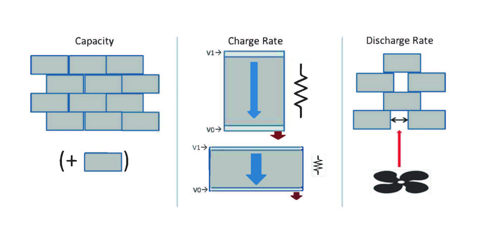 The heat is recovered by blowing air through channels in the brick. The output of FIRES is hot air, which is heated or cooled as needed for the given application by adding natural gas heat or cold air, respectively. The required discharge rate is determined by the furnace hot-air requirements that FIRES is coupled to. FIRES is designed for specific groups of industrial customers. There are three performance characteristics of interest (Figure 4), each of which is largely independent of the other: storage capacity, charge rate, and discharge rate.