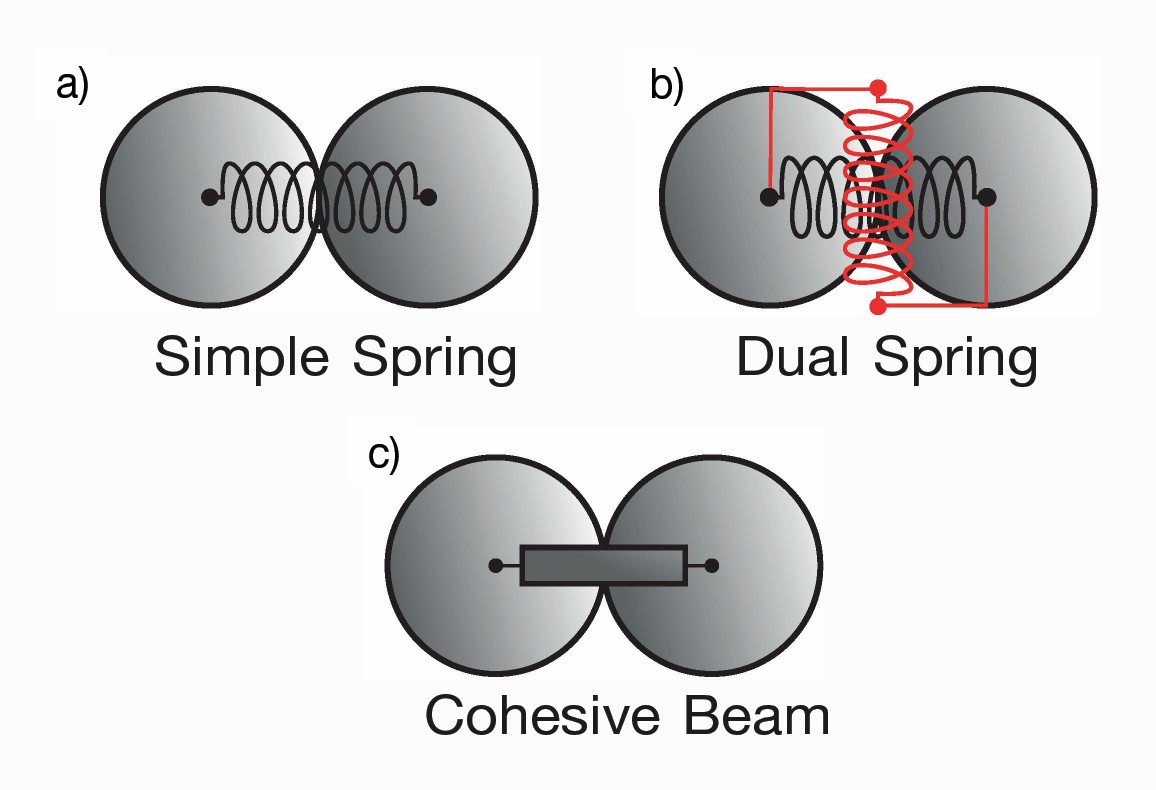 The bond between particles can be based on distinct models. The most common ones are the contact bond (simple spring) model, the dual spring model, the parallel bond and flat joint models,16 and the recently developed cohesive beam model.9 Figure 2 presents a schematic representation of some common bond models.