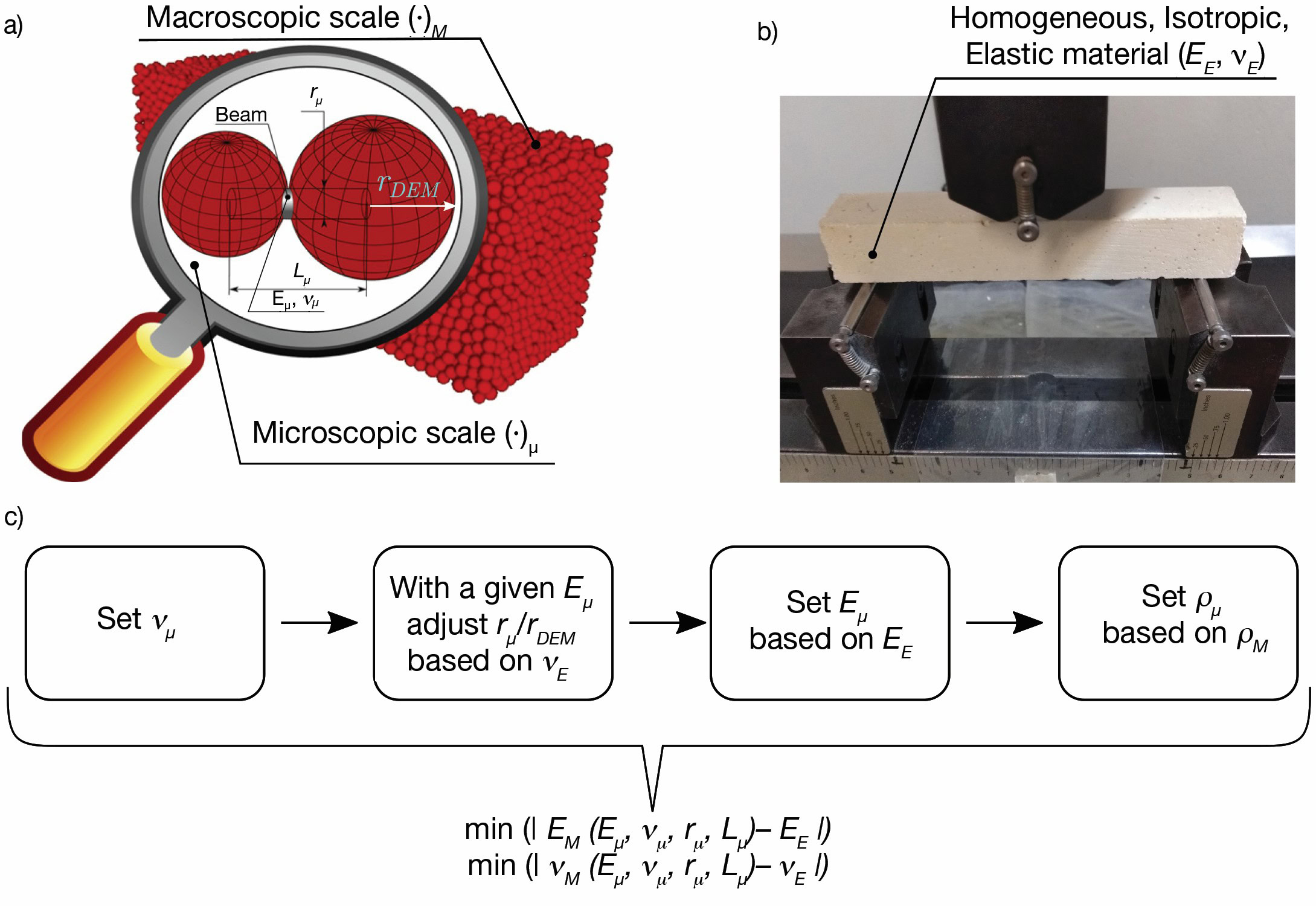 Figure 3. Common procedure for a DEM simulation. a) Describes both scales and the cohesive beam model and its properties, including the beam’s length (Lμ), its radius (rμ), the Young’s Modulus (Eμ), and the Poisson ratio (νμ). b) Shows the actual sample and the assumptions made (an elastic material described by its Young’s Modulus (EE) and the Poisson ratio (νE). c) Presents the automatic calibration algorithm used and its mathematical meaning, the minimization of the difference between simulated macro properties and the experimental ones (adapted from Reference 1). Credit: Moreira et al.