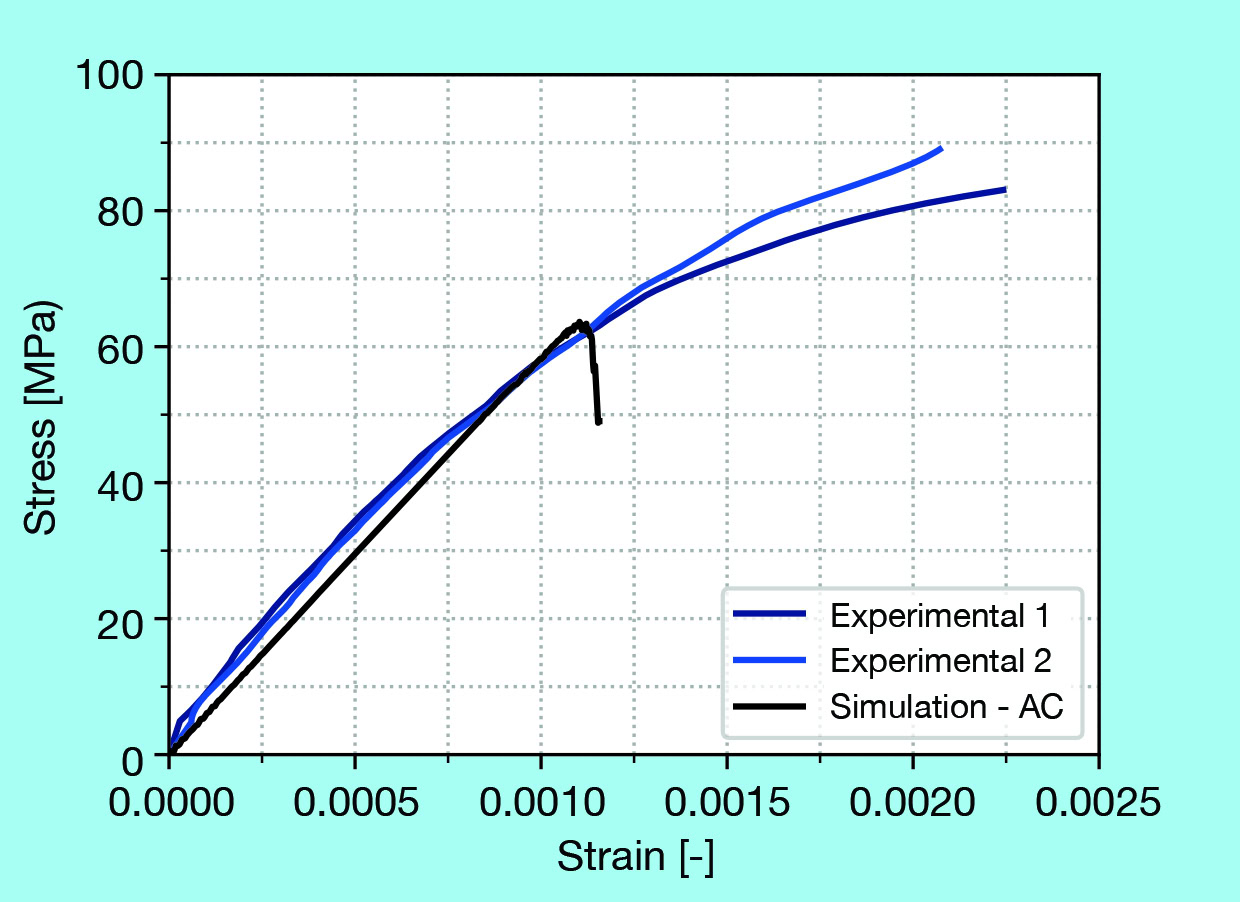 Figure 7. Stress-strain curve for the simulation using the automatic calibration (AC) and the experiments. Credit: Moreira et al.