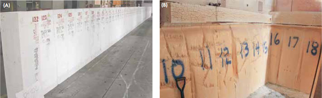 Figure 1. (A) New AZS furnace lining during inspection before delivery and installation. (B) Corroded AZS furnace lining after 6.5 years of service in a soda-lime glass furnace. Credit: Monofrax