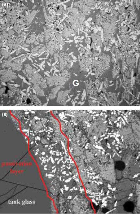This thin reaction layer, often called the passivation layer (“G” in Figures 3A and 3B) because it serves to “passivate” further corrosion, is a byproduct of incongruent dissolution into the tank glass. Alumina in the coprecipitate alumina–zirconia component of AZS goes into solution at the glass–refractory interface, creating a layer of highly aluminous glass with undissolved zirconia (Figure 3 and Table 2).