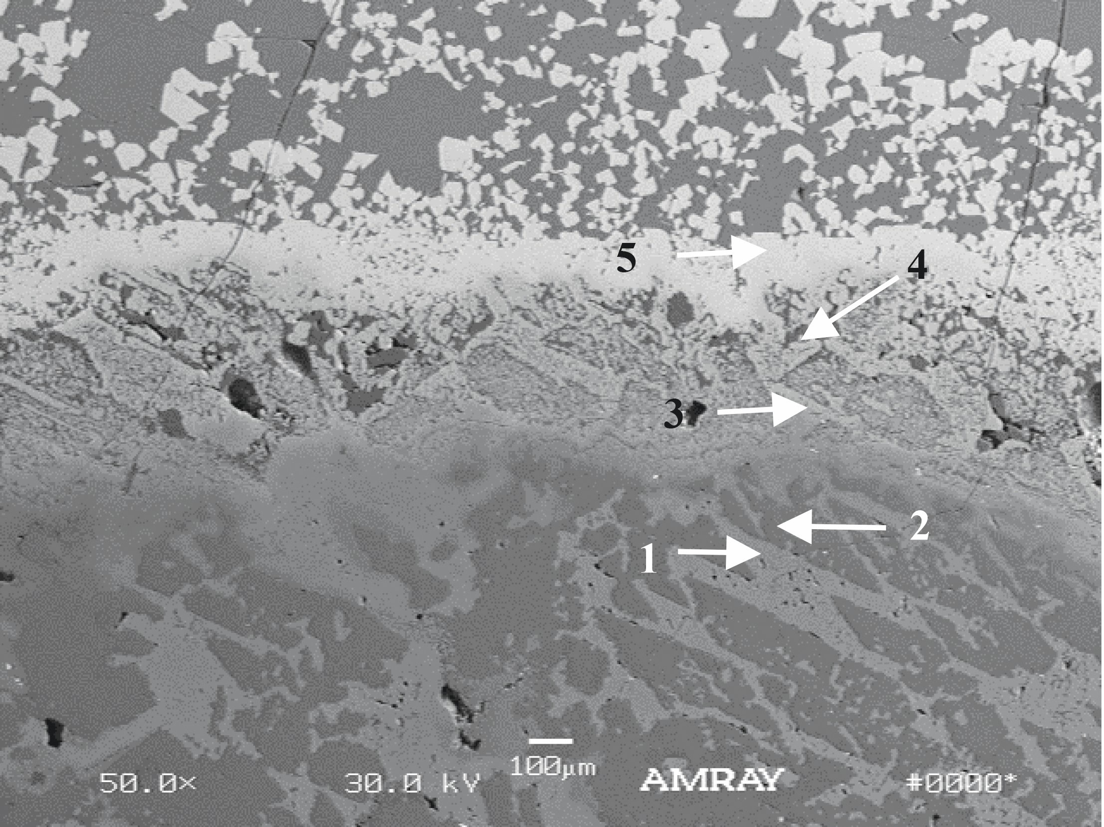 Figure 5. Scanning electron micrograph of the glass–K-3 interface at the bottom of the melter, revealing secondary phase formation at the reaction layer. Phases 1 and 2 are spinel and R2O3 solid solution, respectively. Phases 3, 4 and 5 are spinels with increasing nickel content and oxidized iron closer to the glass. Credit: Monofrax
