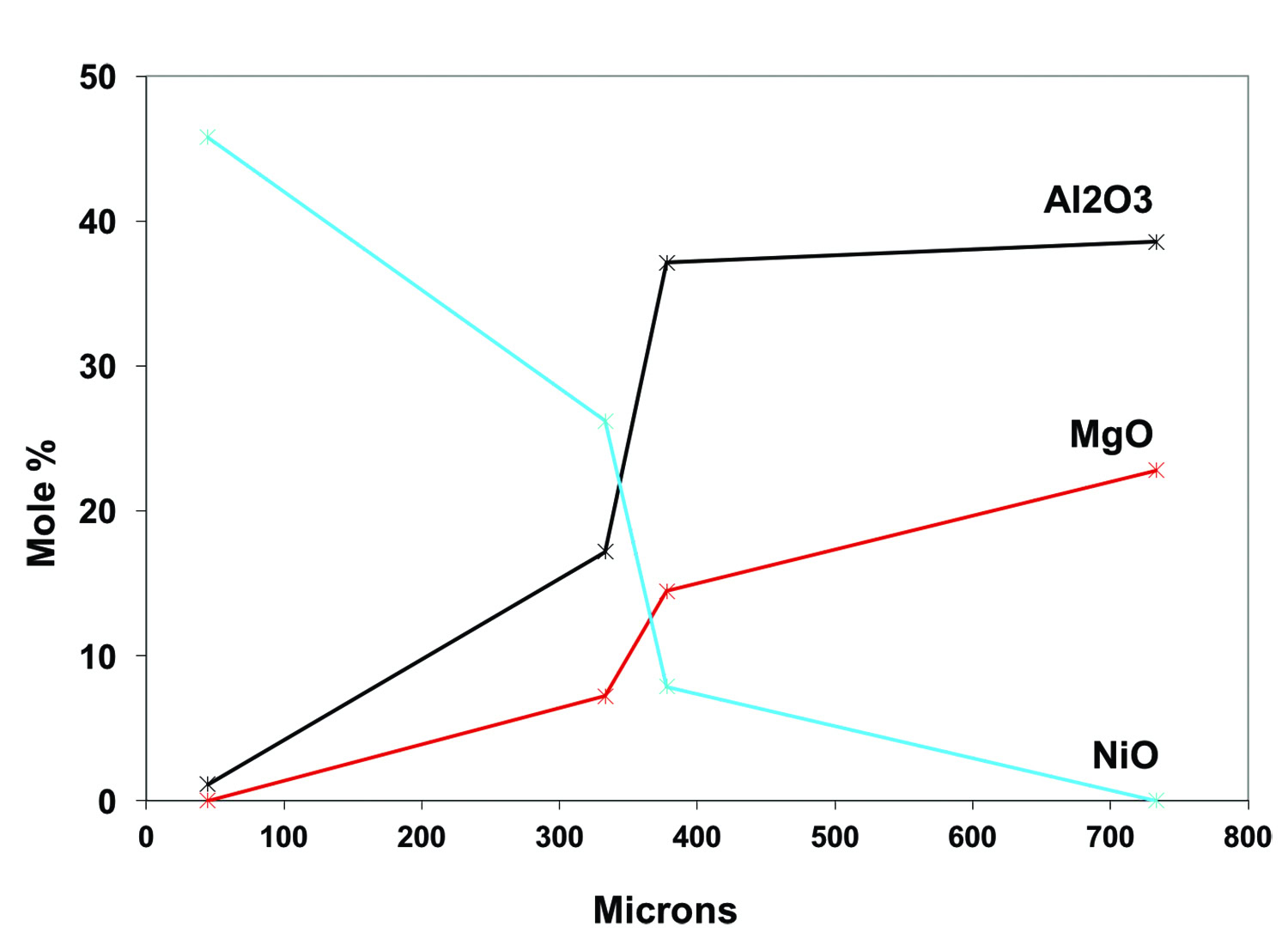 Figure 6. Spinel chemistry as a function of depth for magnesium, aluminum, and nickel oxides from the glass–K-3 interface region toward the interior (data from spinels in Table 3). Credit: Monofrax