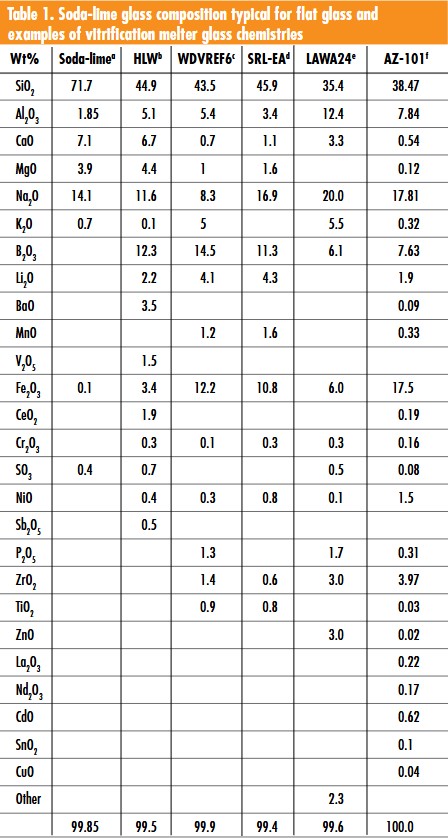 The temperatures encountered in vitrification melters (~1,050°C–1,200°C) are considerably lower than in commercial soda-lime glass tanks (~1,500°C–1,600°C). Table 1 lists soda-lime glass compositions typical for flat glass, alongside some examples of vitrification melter glass chemistries.