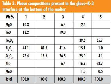 Additional characterization of K-3 involved a research scale melter (RSM) from the Pacific Northwest National Laboratory (PNNL) that consisted of a small Monofrax K-3 cylindrical chamber with a 6-inch diameter melt pool. A test with this melter consisted of eleven weeks at temperatures of 1,050°C–1,150°C to observe the behavior of crystals precipitating out of the melt, which potentially can clog the outlet feeder to the holding cylinder.