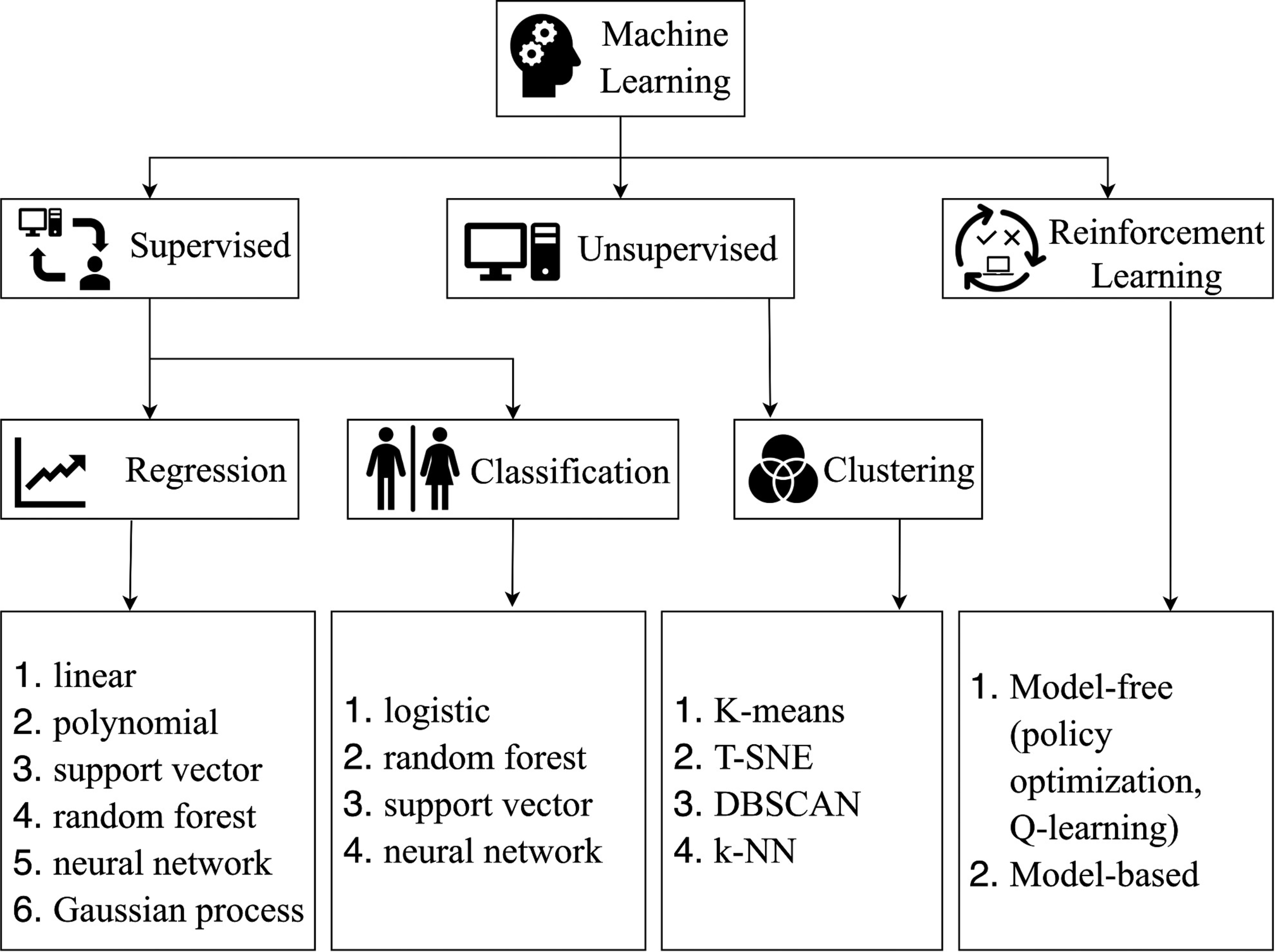 Basic machine learning paradigm Machine learning approaches are broadly classified into three types: supervised, unsupervised, and reinforcement learning. Supervised learning involves an algorithm that “learns” a function that maps input information to an output using “training” data. Unsupervised learning seeks to uncover hidden, unlabeled patterns in data. Because the algorithm does not map onto an output, the approach is “unsupervised.” Reinforced learning is more useful in systems applications, such as robotics or high-throughput laboratory techniques, and is not used much for glass or materials science applications.1 The four boxes across the bottom list the algorithms that execute the machine learning functions. Credit: Venugopal et al., IJAGS