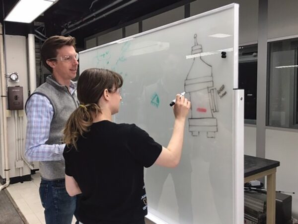 Figure 7. Strandwitz and Ph.D. student Alexandra Howzen discuss reactor design and the challenges and opportunities associated with integrating RHEED and ALD. Credit: Nicholas C. Strandwitz