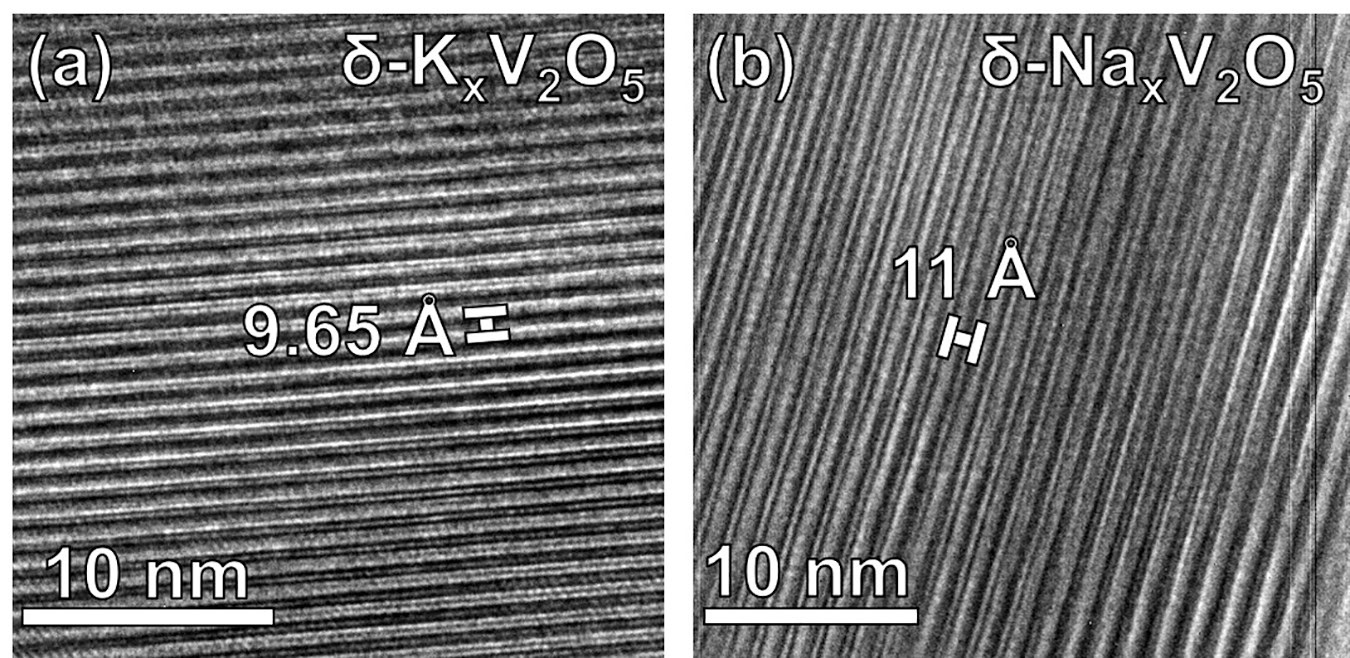 Figure 4. Transmission electron microscopy images of layered oxide materials synthesized in Pomerantseva’s group demonstrating an ability to tune interlayer distance by controlling synthesis conditions. These materials were obtained via chemical pre-intercalation of potassium (a) and sodium (b) ions into the interlayer region of bilayered vanadium oxide, a high-capacity cathode material in intercalation batteries. Credit: Ekaterina Pomerantseva