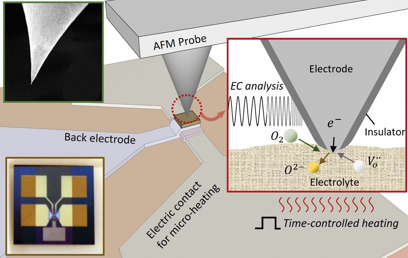 Solid oxide fuel cells—devices that produces electricity directly from oxidizing a fuel—offer clean and efficient energy conversion. The performance of SOFCs and electrolyzers are largely affected by the kinetics of oxygen electrochemical reduction/evolution reactions (ORR/OER). While each elementary process of the reaction is intrinsically a nanoscale phenomenon dictated by local material properties and geometry, the electrochemical properties have been mostly analyzed through bulk (volume-averaged) measurements. To obtain a breakthrough in electrode design, a more thorough understanding of the underpinning mechanisms of the reactions at the nanoscale is needed. This research12–13 stands to advance the understanding of ORR/OER processes through in situ nanoscale observations by leveraging a novel scanning probe-based setup with a microscale heater (Figure 6). There are three significant aspects: 1) demonstrating a new high temperature scanning probe-based approach for in situ nanoscale characterizations of electrochemical surface reaction and charge transport kinetics under operating oxygen activities; 2) pioneering novel time-resolved nanoscale characterization of thermally-activated processes; and 3) providing deeper insight regarding the ORR/OER and related charge transport at the nanoscale.