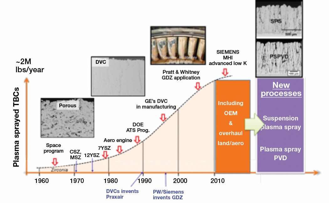 Figure 2. Growth of the application of thermal barrier coatings via plasma spray (in pounds per year of powder consumption) since its evolution as well as key current and emerging microstructure, materials, and process variants.15 Credit: Sanjay Sampath