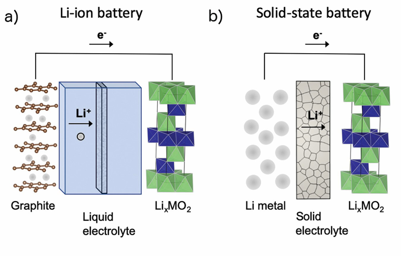 Figure 2. (a) Schematic of Li-ion battery with liquid electrolyte, separator, and graphite anode. (b) Schematic of solid-state battery with solid electrolyte stabilizing a Li-metal anode. Credit: Nathan Taylor