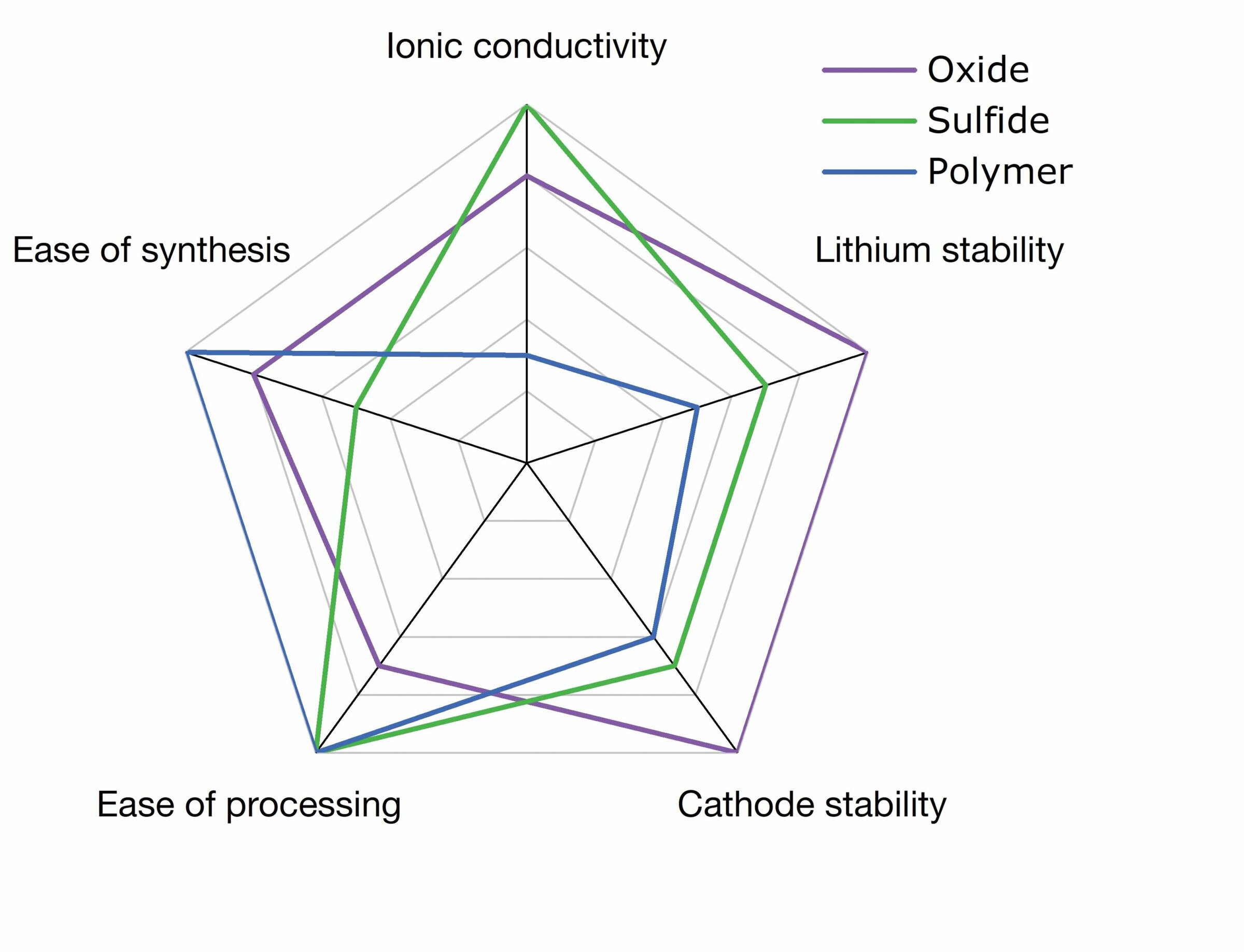 Figure 3. Radar chart for electrochemical and physical properties of oxide, sulfide, and polymer solid electrolytes. Credit: Nathan Taylor