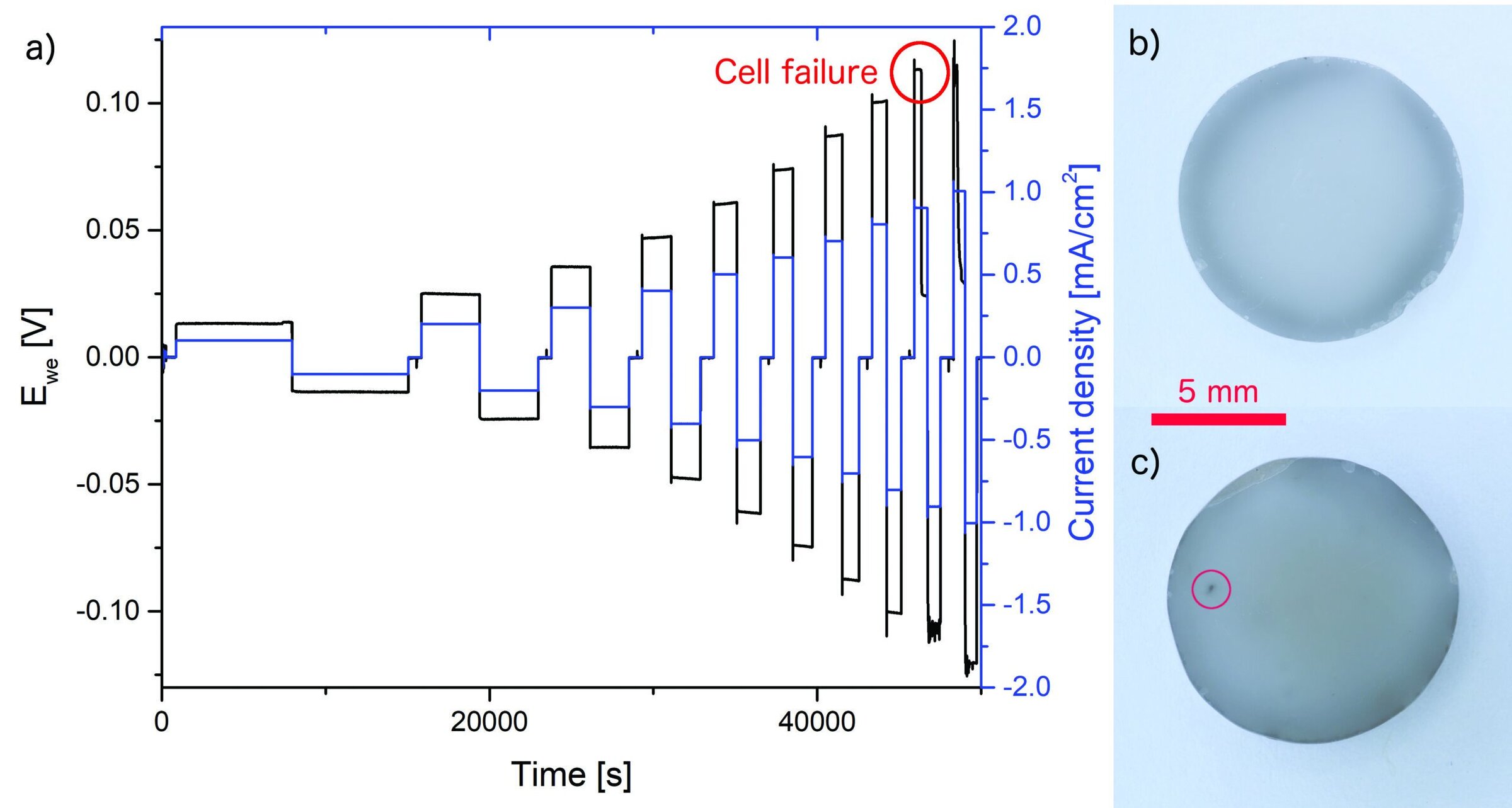 Figure 4. (a) Typical CCD test of lithium symmetric cell with increasing stepped current values until cell failure, establishing CCD. (b) LLZO cycled below the CCD with no visible damage. (c) LLZO after failure during CCD test, with black spot indicating failure due to lithium penetration.* Credit: Elsevier. *Adapted from N.J. Taylor, S. Stangeland-Molo, C.G. Haslam, et al. “Demonstration of high current densities and extended cycling in the garnet Li7La3Zr2O12 solid electrolyte”, J. Power Sources, 396 (2018). Copyright 2018 Elsevier, used with permission.