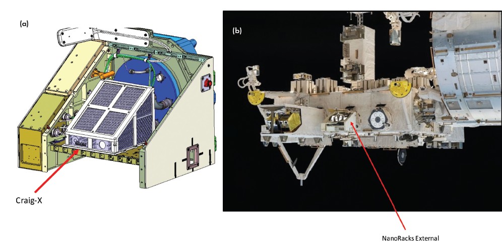 Figure 10. A dozen 3-D-printed samples will be assembled in holders and placed in a Craig-X flight test platform (a), which will be mounted inside of the NanoRacks External Platform (b) located on the back side of the Japanese External Module – Exposed Facility. Credit: Ryan Jeffrey and Carol Craig