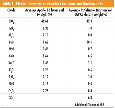 In 2020, NASA will send a utility vehicle called “Resource Prospector” to the moon, where it will “drill” into the ground and collect soils (Figure 1).3 This expedition will provide useful information about the compositions of lunar (regolith) soils, although some information is already known from past missions. For average Apollo 15 soils with grain sizes of <1 mm, Table 1 shows tabulated weight percentages of metal oxides.4–5 In addition, a NASA reference publication documents grain sizes of lunar soils.6 For example, Figure 2 plots weight percentage as a function of sieve size for soil sample No. 75080, showing that approximately 91% of grains have sizes of <1 mm. For Martian soils, weight percent ages of compositions can be derived from alpha-particle X-ray spectrometer (APXS) techniques, as illustrated in Table 1.7