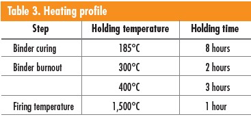 To prepare batch B, we used the same fused alumina as batch A to print 3-D objects, which were then dip-coated with clear glaze materials (56% boric acid, 3.44% soda ash, 8.94% whiting, 13.41% flint, and 17.88% EPK kaolin; SiO2, B2O3, Al2O3, MgO, CaO, and Fe2O3). Objects were heat-treated at a maximum temperature of 1,500 C.