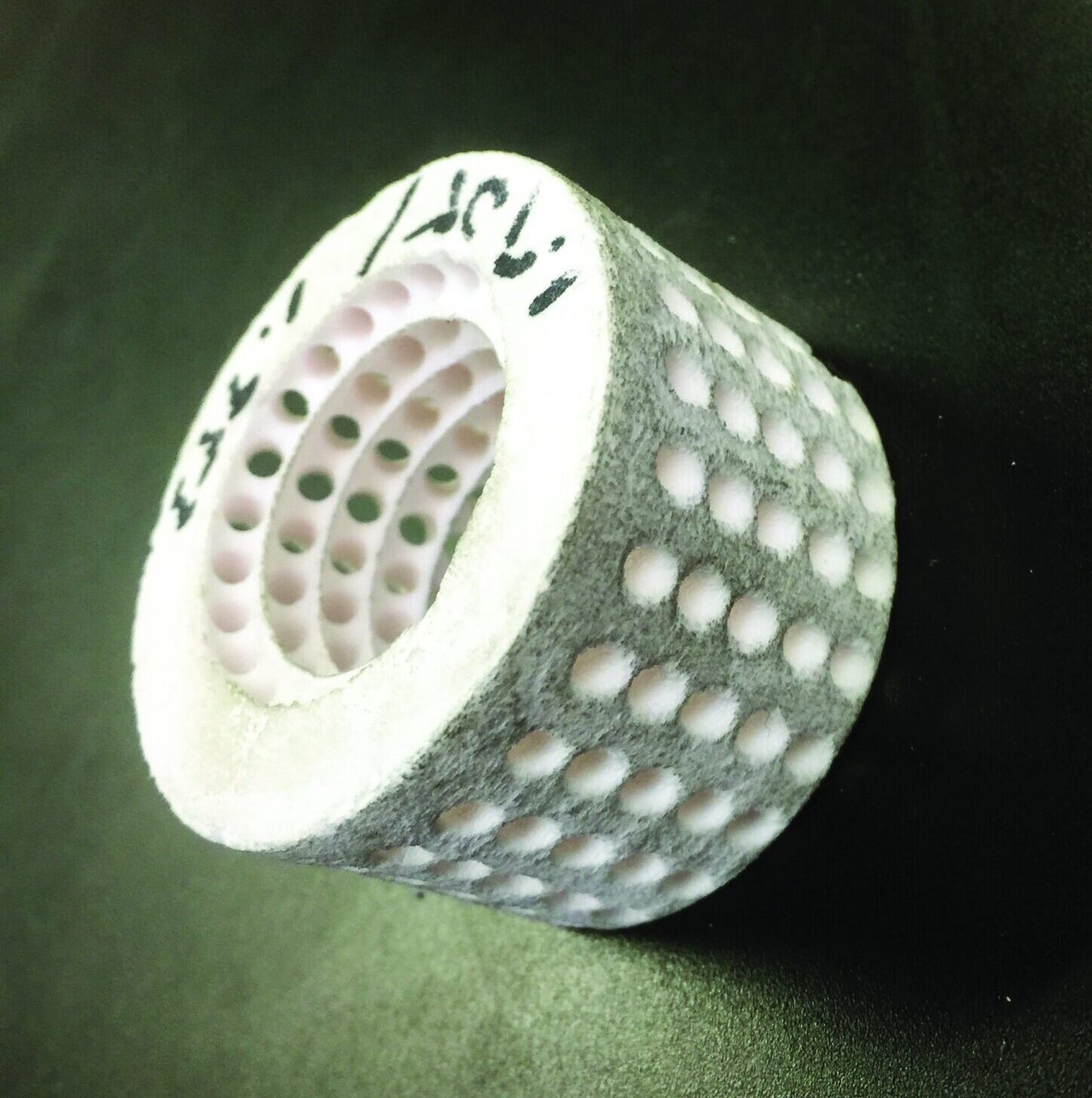 We printed various shapes, including discs, washers, bars, and simple sculptures. Figure 3 shows a cylindrical-shaped object with different sized holes (outer diameter =~5 cm; height =~3 cm), which can be used for humidity sensors and chemical sniffers.
