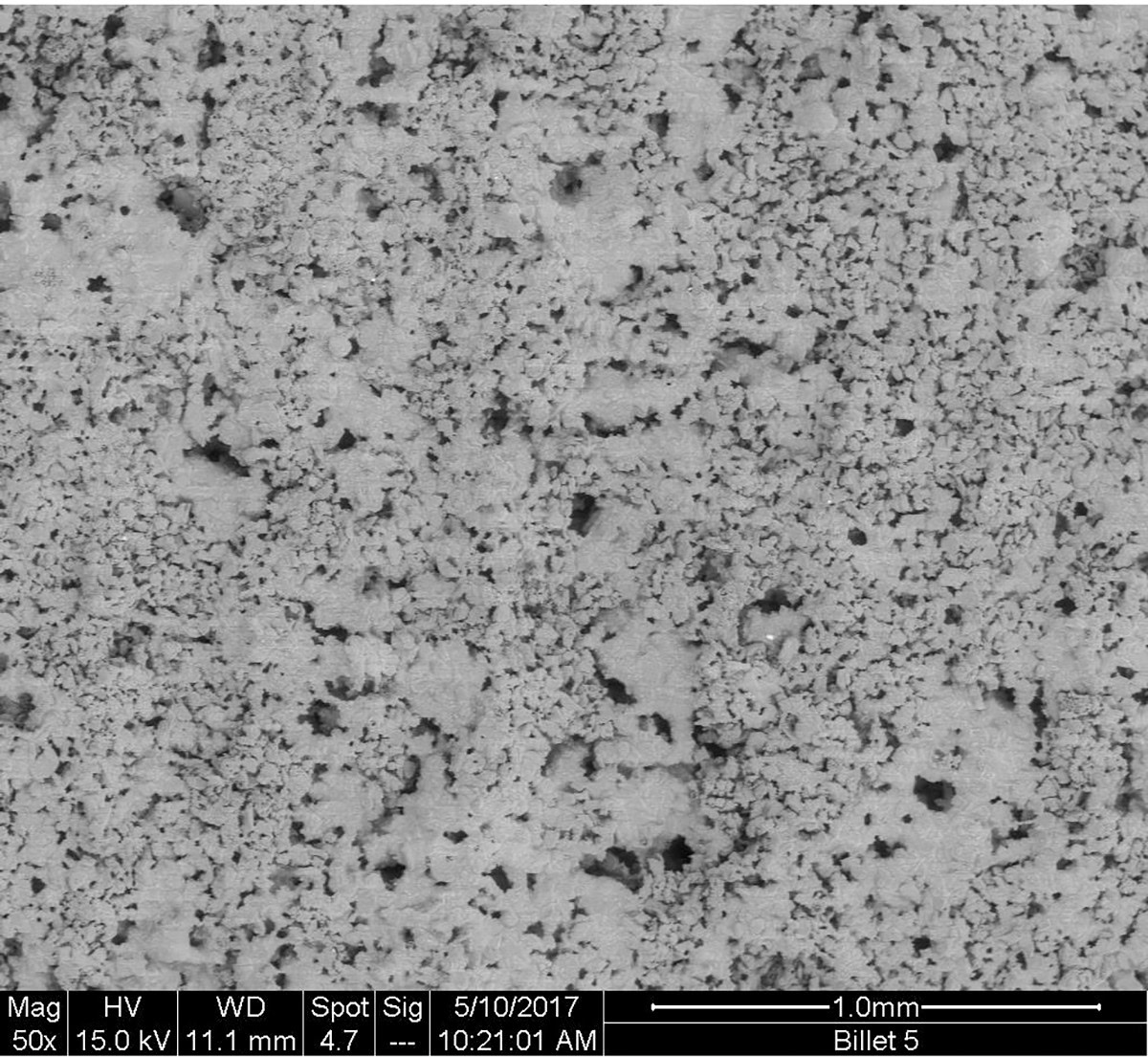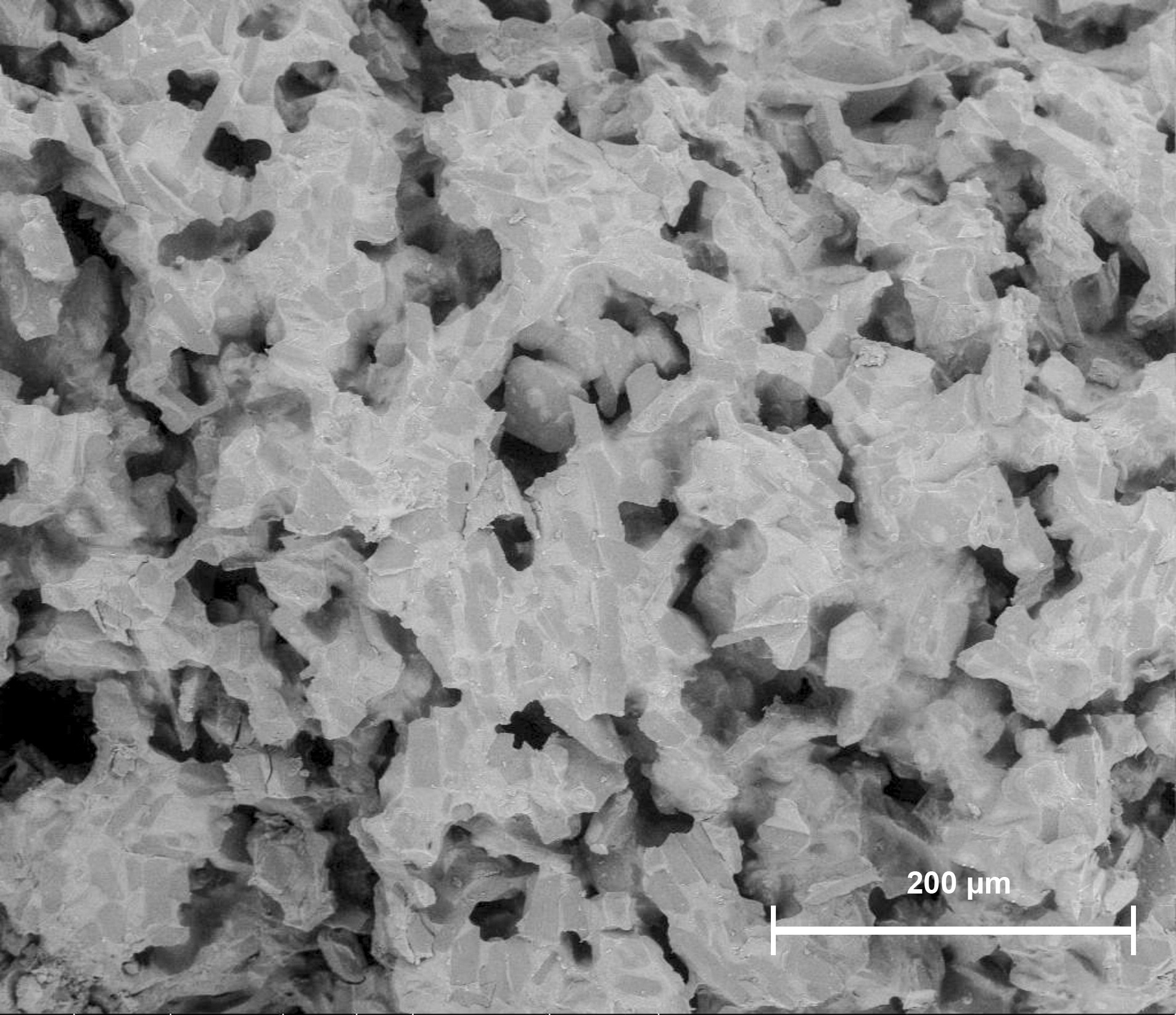 Figure 9b. Higher magnification scanning electron micrograph of top view of a batch B sample. Scale bar represents 500 µm. Credit: Gerry Wynick