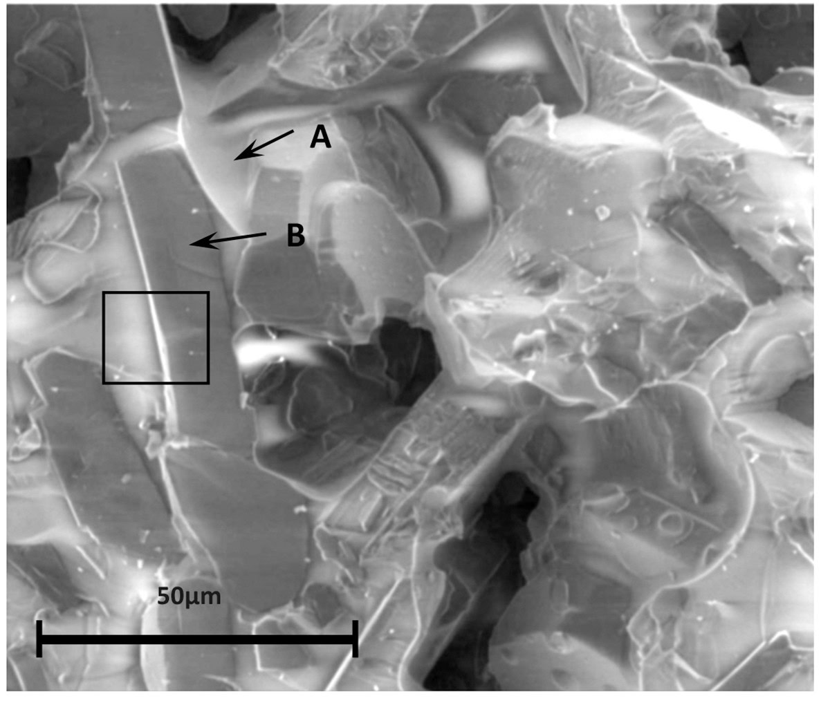 Figure 5. Higher magnification of a scanning electron micrograph charge contrast image showing a glassy phase (A), which will be monitored for the effects of radiation exposure, and a representative alumina grain (B) in a batch A sample. The area inside the rectangle is enlarged in Figure 6. Credit: Gerry Wynick