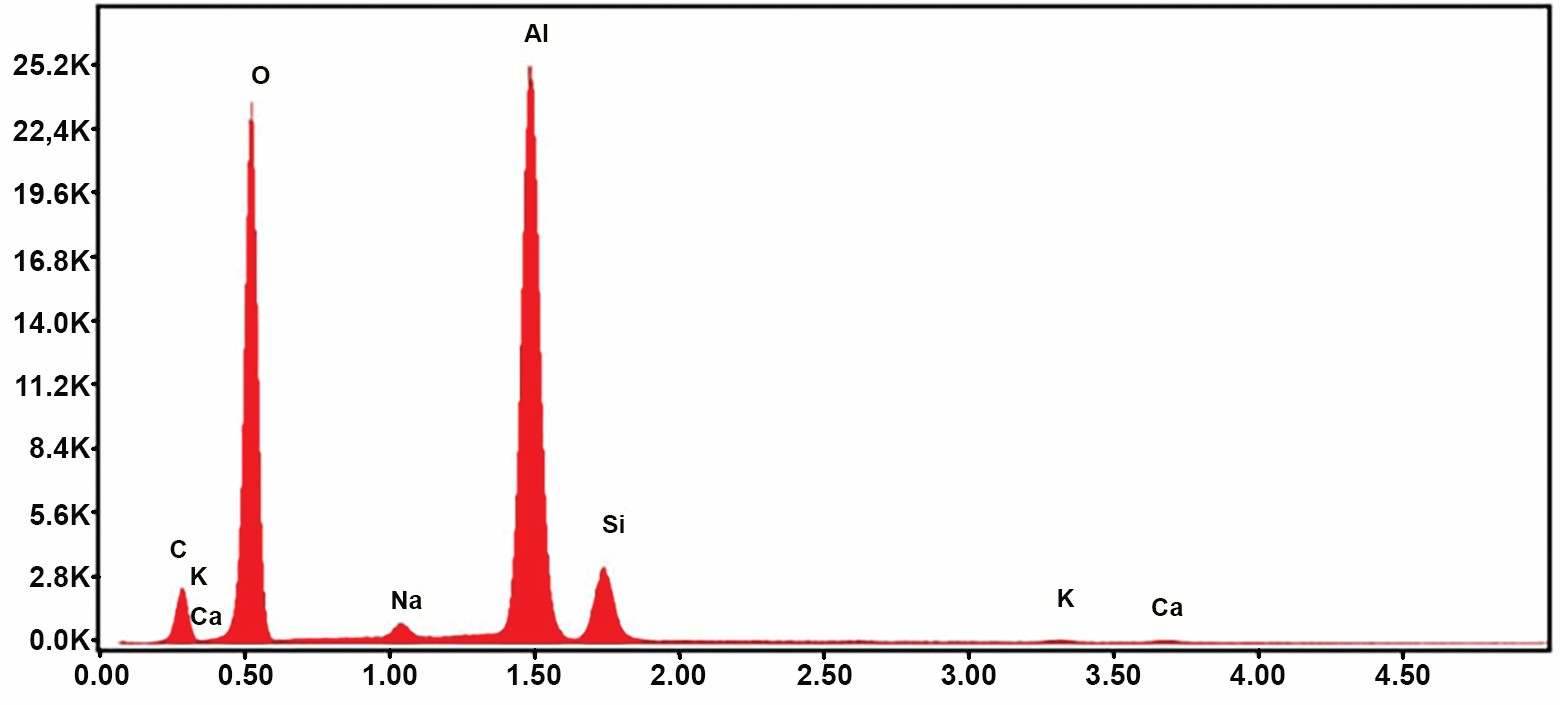 Energy-dispersive X-ray spectroscopy (EDS) of batch A detected Al, Si, Na, and O signatures (Figure 7). X-ray photoelectron spectroscopy (XPS) of the same sample revealed Al, Si, Na, Ca, O, and C signatures (Figure 8).15 The carbon signature may be mainly due to sample handling and possibly related to residual carbon from organic binder materials that require more extensive heat treatment processes, such as longer furnace holding times. Other signatures are all related to precursor materials.