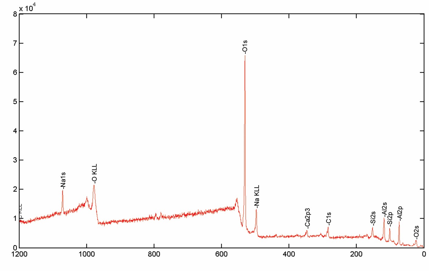 Figure 8. X-ray photoelectron spectroscopy spectrum of batch A sample, showing Al, Si, Na, Ca, O, and C signatures. Credit: Jim Thiebaud
